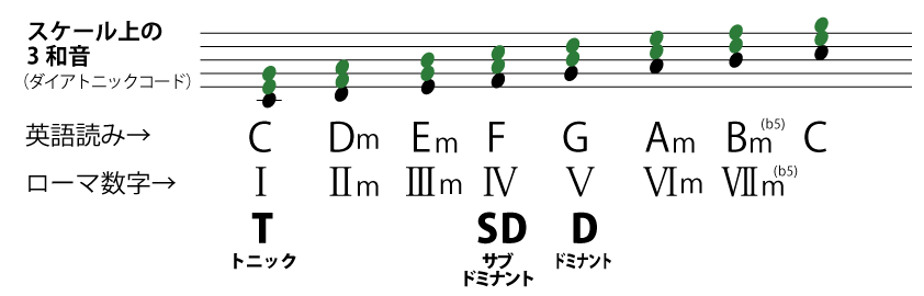 英語表記に3和音で構成されたコードネームが表示されます。これをトライアドと呼び3和音によるコードネームが出来ました。 これが皆さんがご存じのコードネームです。