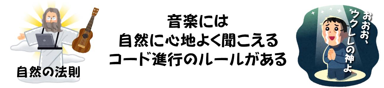 人間が音楽を聴く際に「気持ちいい」と感じる旋律の流れ、つまりコードの流れというものには不思議とルールがある(必ずそうなっていく)からなんです。もちろん、ルール(パターン)だけで音楽が成り立っているわけではないのですが、こういったコードパターンを知っているだけでも音楽が格段に楽しくなります。