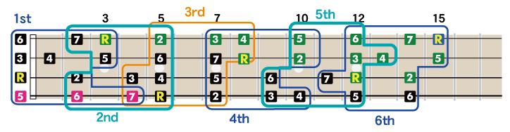 下記のイラストはスケールを15フレットまで設定し、さらにブロック分けしてあるものです。6つのブロックに分けてありますが、この6ブロックが重要です。指の流れがスムーズに動くポジションで分けてあります。各ブロックごとに運指トレーニングを行うと良いでしょう。この練習は指のルールを守らなければ意味がありません。間違っても指一本で弾くような練習をしてはいけません。