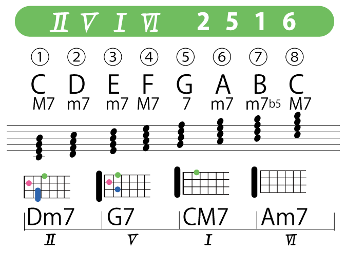 2516(ⅡⅤⅠⅥ)というのは、基準となるキーのトニックから数えて2番目・5番目・1番目・6番目となる4和音のダイアトニックコードのことです。音楽を学ぶ時に知っていると大変役に立つコードの読み方で、プロミュージシャンはこのような読み方で仲間同士で会話することが多いです。
