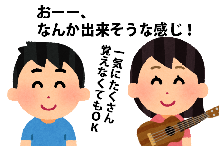 いわゆる初心者向けの楽譜にはコードの押さえ方を記載したダイアグラムが併記されています。多くの方はこのダイアグラムを見ながらウクレレを弾くため、いつまでたってもコードを覚えることが出来ません。出来ればコードネームだけで弾く練習を行ってください。極めて短期間でコードを覚えられるようになります。