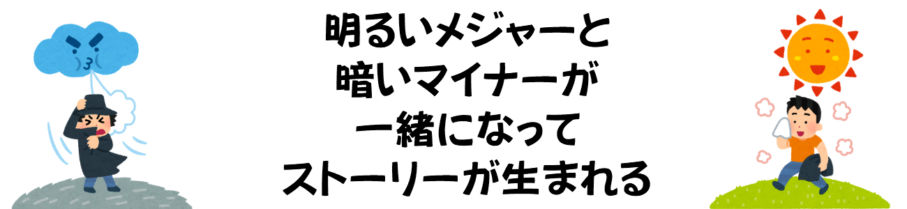 マイナーコードをいくつか覚えたら、メジャーのコードとミックスされた曲を使って練習を行ってください。明るい響きのメジャー系コードと暗い響きを持つマイナー系のコードをミックスすることでその楽曲にはストーリーが生まれてきます。ストーリーのある楽曲は覚えやすく、出てくるコードもしっかり覚えられるようになってきます。