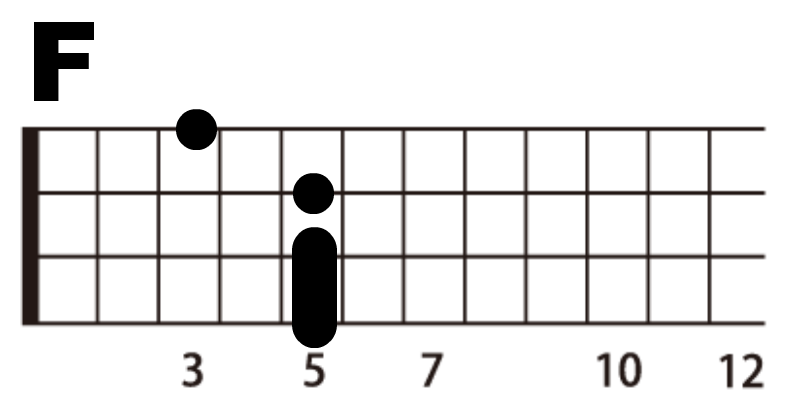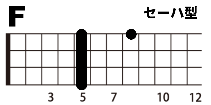 Fは2種類の押さえ方を掲載しました。セーハ型とセーハを使わないポジションです。どちらも使いこなせるようになってください。セーハ型の場合、ハイコードのCとG7に比べて1弦8フレットの音を使うことになるため、弾き語りで使用する際に高音部が飛び出したように聞こえます。そのためセーハを使わないFも覚えておく必要があります。