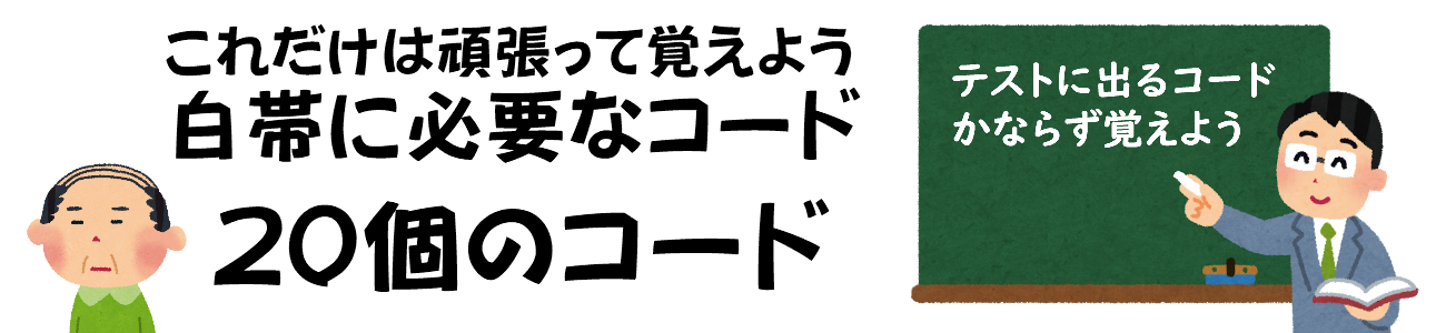そろそろ白帯卒業となります。白帯はウクレレと仲良しになることが最大の目標なので、難しいコードは必要ありません。ジャンジャン鳴らして楽しくやってください。とはいえ、基本になるコードは覚えておきたいわけでして、コードを知らない・押さえられないとなるとその楽しみも半減してしまいますよね。1週間に1個ずつでも良いのでしっかりコードを覚えましょう。中にはコードが覚えられないという方もいらっしゃるかもしれませんが、気にすることはありません。コードダイアグラム(押さえ方の絵)を見ながらのんびり楽しんでください。