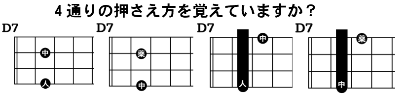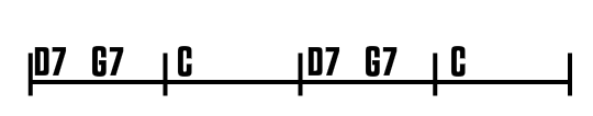 「D7を2拍+G7を2拍/Cを4拍・・・・」これをワンセットにして繰り返してください。何度も何度も繰り返して完全に覚えましょう。コードのダイアグラムなしで弾けるようになるまでです。慣れたら左手も見ないで出来るようになりましょう。ここはひたすら練習しかありません。