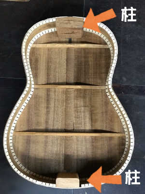 ウクレレの内部にはボディーのエンド部分とネックの接合部分に柱があって、ウクレレ全体を支えてあります。サウンドホールから覗いてもネック側しか見ることが出来ません。
