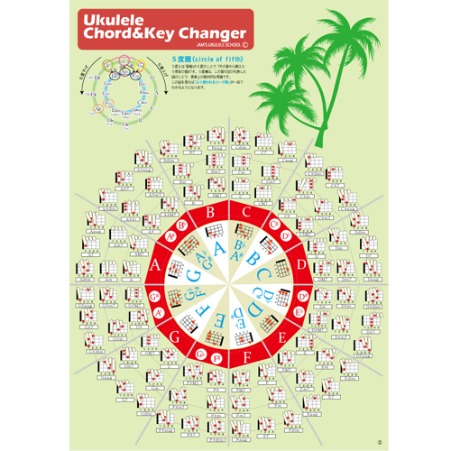 そのような難しいコードが多数出てくる曲の場合はウクレレにとって弾きやすいコードに変換する方法と商品があります。それがウクレレキー&コードチェンジャーです。ウクレレはCkeyが最も弾きやすい楽器なので、出てくるコードを弾きなれたものに変換すれば難しい楽曲も弾きやすくできます。2016年の発売以来売れ続けているウクレレ便利グッズです。コードの押さえ方も書いてあるのでコード表としても使用できます。