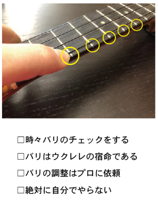 ウクレレの指板には金属のフレットが打ち込まれています。指板は木材でフレットは金属です。当然伸縮率が違います。乾燥すると指板のほうが縮み(痩せるという)ますが、フレットは金属なので縮みません。これはウクレレやギターのようなフレットがある楽器の宿命です。バリを防ぐには乾燥させないようにするしかありません。バリが出るとウクレレのネックの両端を指でスーッと滑らせてみると「痛い」と感じます。バリが出た場合は専門店で調整してもらうしかありません。