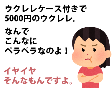 低価格のウクレレにおまけでついてくるケースはお持ち帰り用の袋だと思ってください。機能性は全くありません。クッションもついていませんから、ちょっとぶつけただけでウクレレにキズが入りますし、壊れる場合も多々あります。あくまでもおまけのケースですから早めに普通のケースを購入してください。このケースはほとんどの場合大量生産された粗悪品ですから、ファスナーの壊れや縫製部分のほつれなどが当然のように起こります。タダで付いてきた袋ですから、お店にクレームをつけるのは筋違い。コンビニのビニール袋に取っ手とファスナーが付きました・・・程度で考えましょう。当然ながらビニールやナイロン素材がほとんどですから、通気性が悪く、長期間ウクレレを入れたままにすると悪影響が起こります。ネット通販で買った安いウクレレだとケースのほうが高くなるかも。